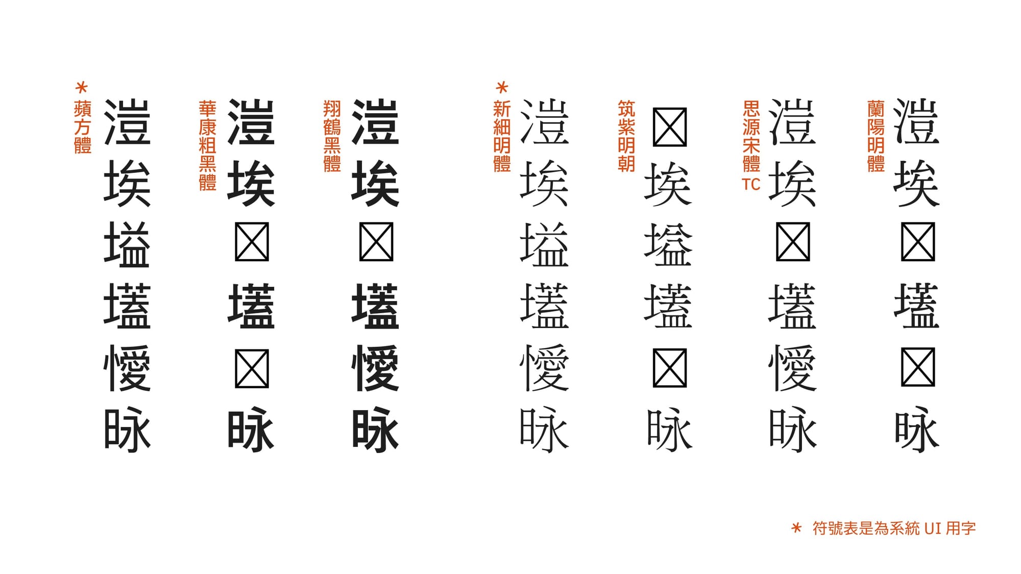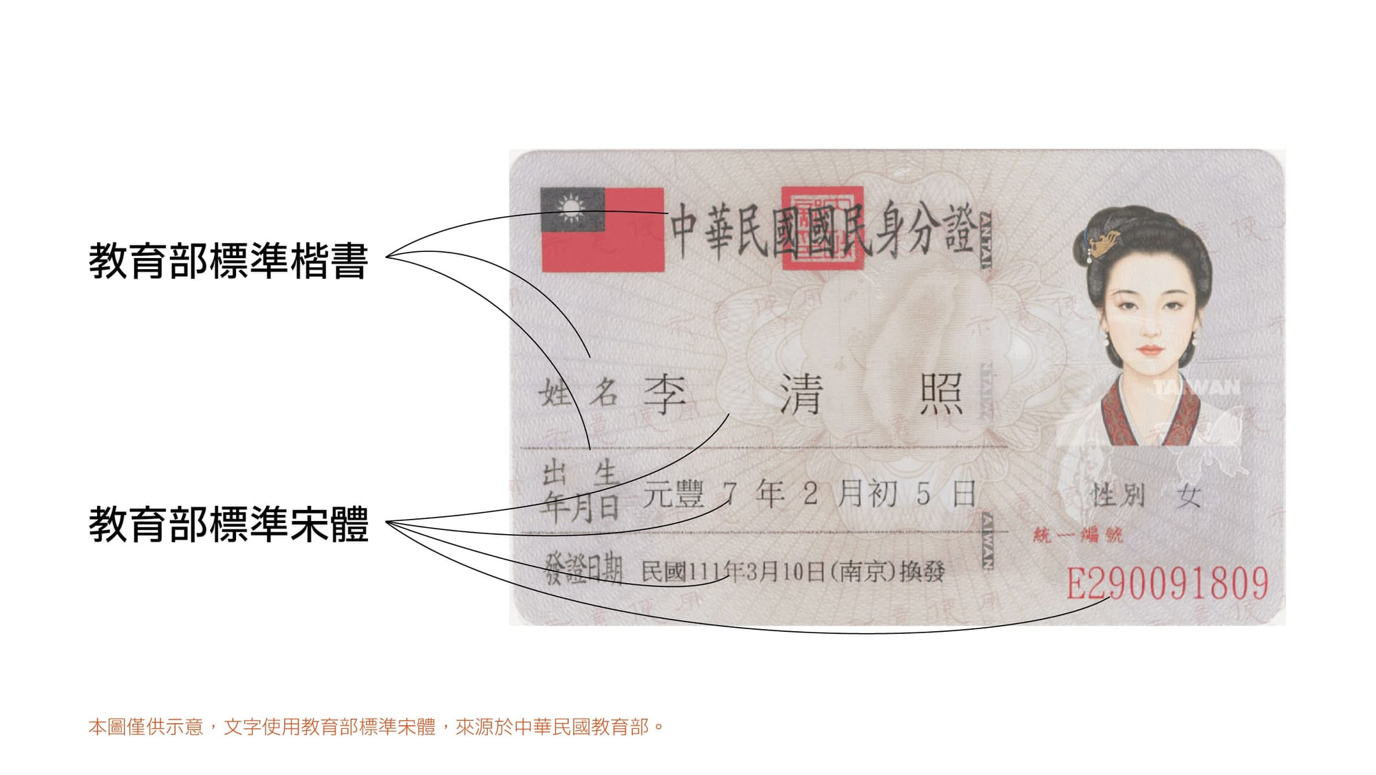 這樣的做法在醫院系統、身分證件......等,長出現生僻字之場景十分常見,像是身分證上就採用了「教育部標準宋體」,一款「新細明體」的胞弟字體,雖說在美感上較於基礎,但收錄字數廣,共有 24,034 個字符,適合用於顯示姓名。