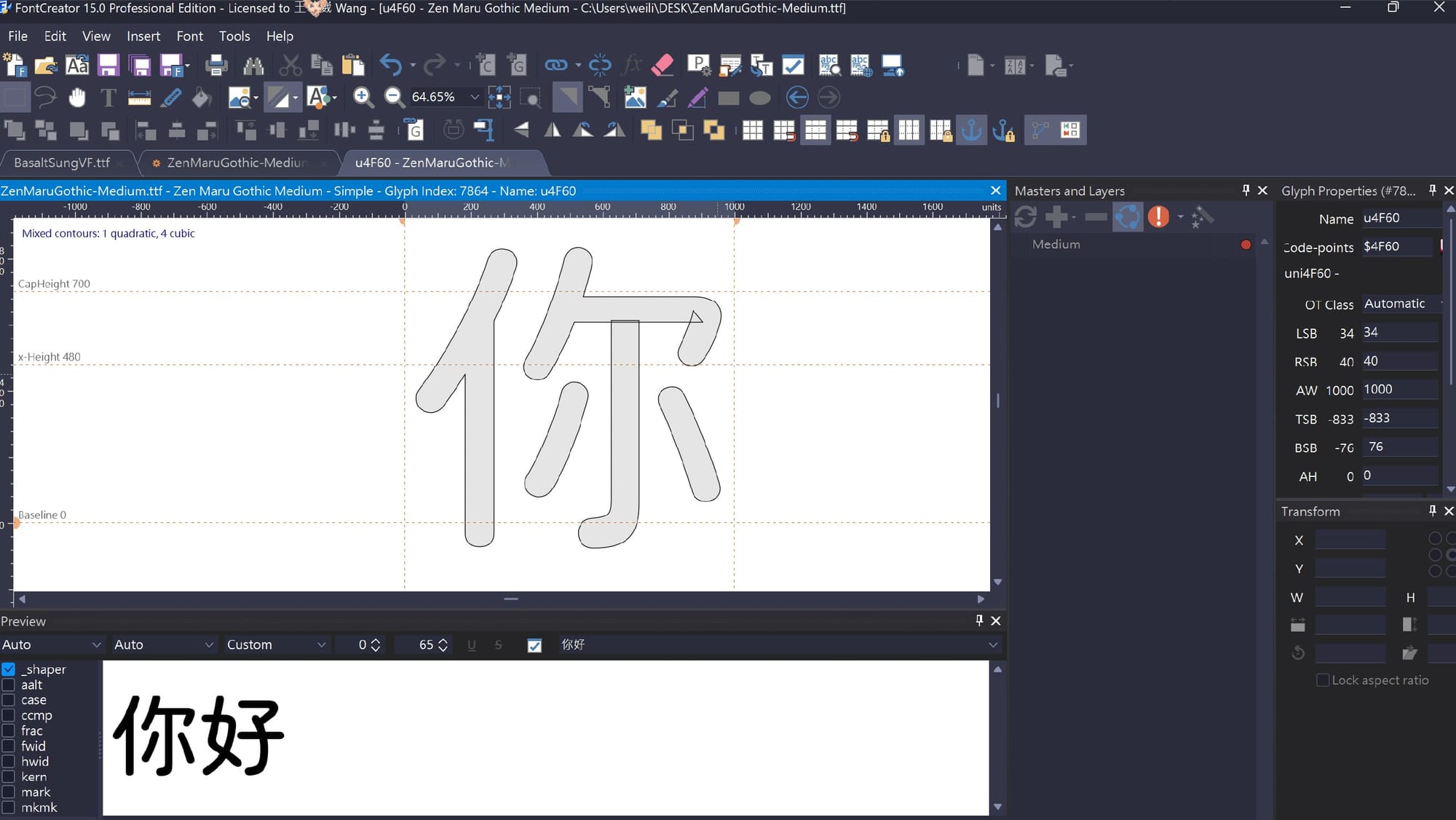 此處使用Zen Maru Gothic進行補字作業,因為該字體為日文字形,缺少「你」,因此抓取「祢」與「仁」拼湊後微調。