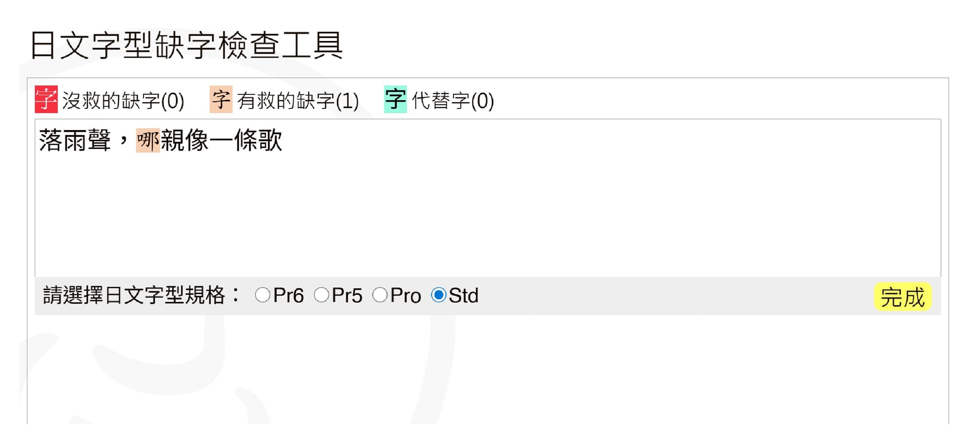 接著我們能使用網路工具——柯志杰先生製作的「字嗨:日文字型缺字檢查工具」,將文本輸入,並選擇對應字集,查看是否有可替代之可能。